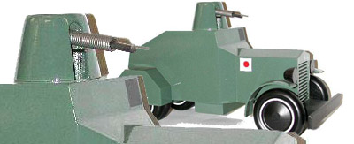 L'automitrailleuse du Lotus Bleu est composé de peu de pièces : une pièce qui comporte l'habitacle, un pare chocs, deux phares et une mitrailleuse amovibles. Deux autocollants représentant le drapeau japonais sont collés sur les flancs avant du véhicule. L'objet est recouvert d'une peinture pour voiture qui conserve sa brillance. Ce véhicule ne comporte pas de personnages. Cet objet est sous licence Aroutcheff.